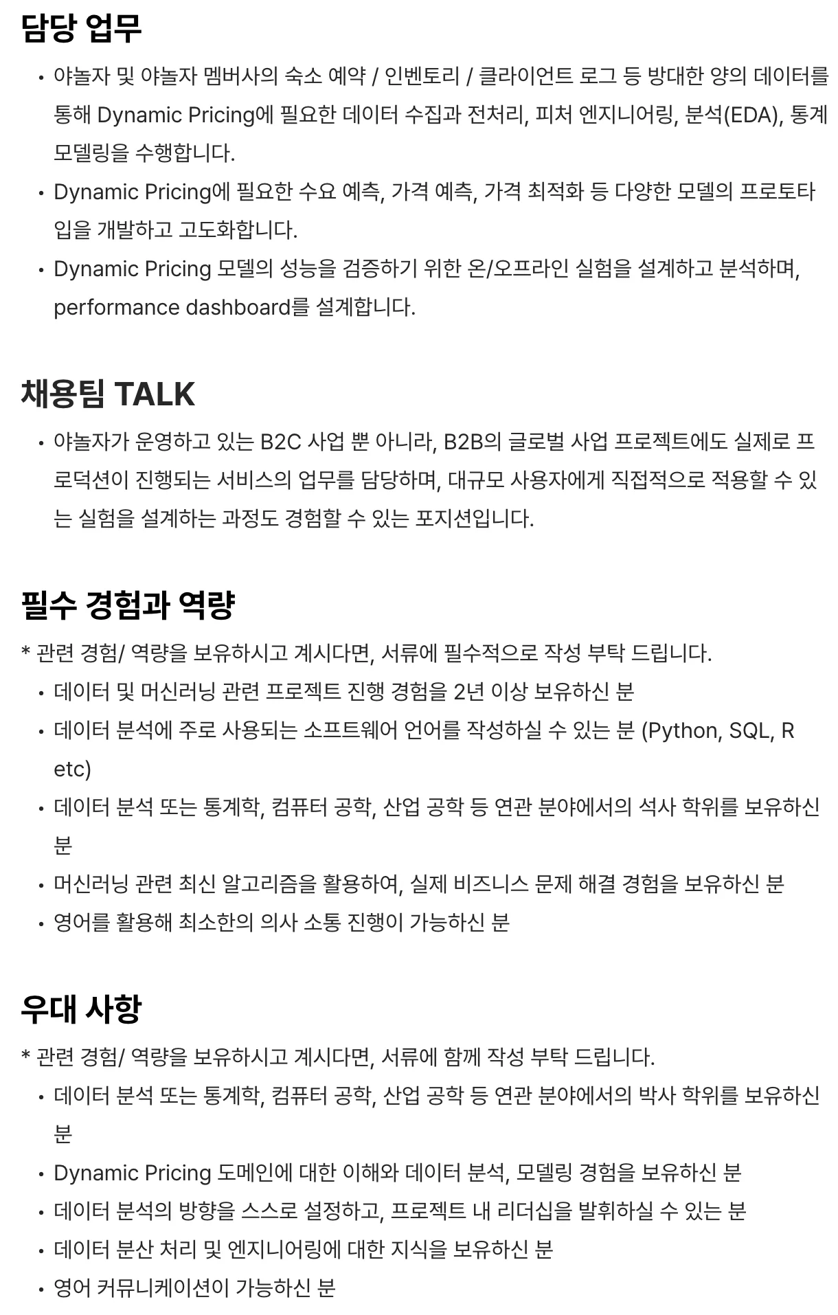 ** 야놀자 Data Scientist 채용공고 예시