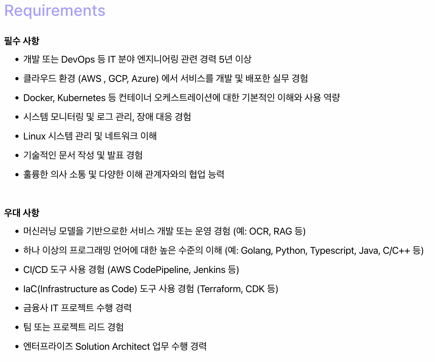 ** 업스테이지 Senior Solution Architect 채용공고 예시